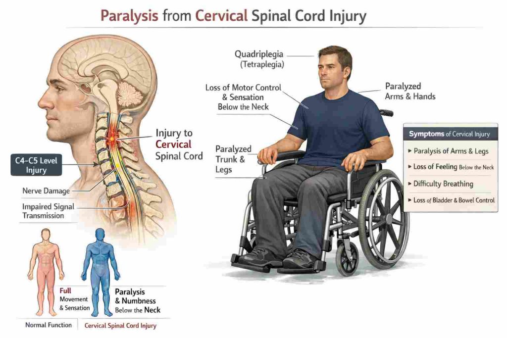 - Cervical (C1–C8): Neck level. May affect arms and legs. Severe cases can cause quadriplegia, meaning weakness or paralysis in all four limbs.