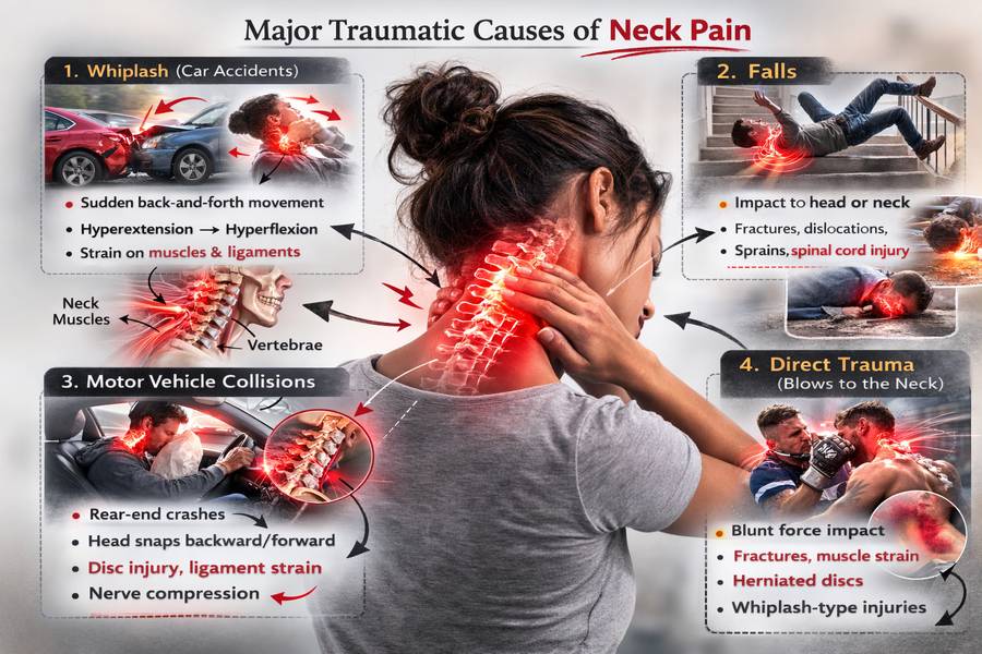 High-speed collisions or significant falls can produce vertebral fractures. CT scanning provides detailed fracture assessment. Instability may require surgical fixation.